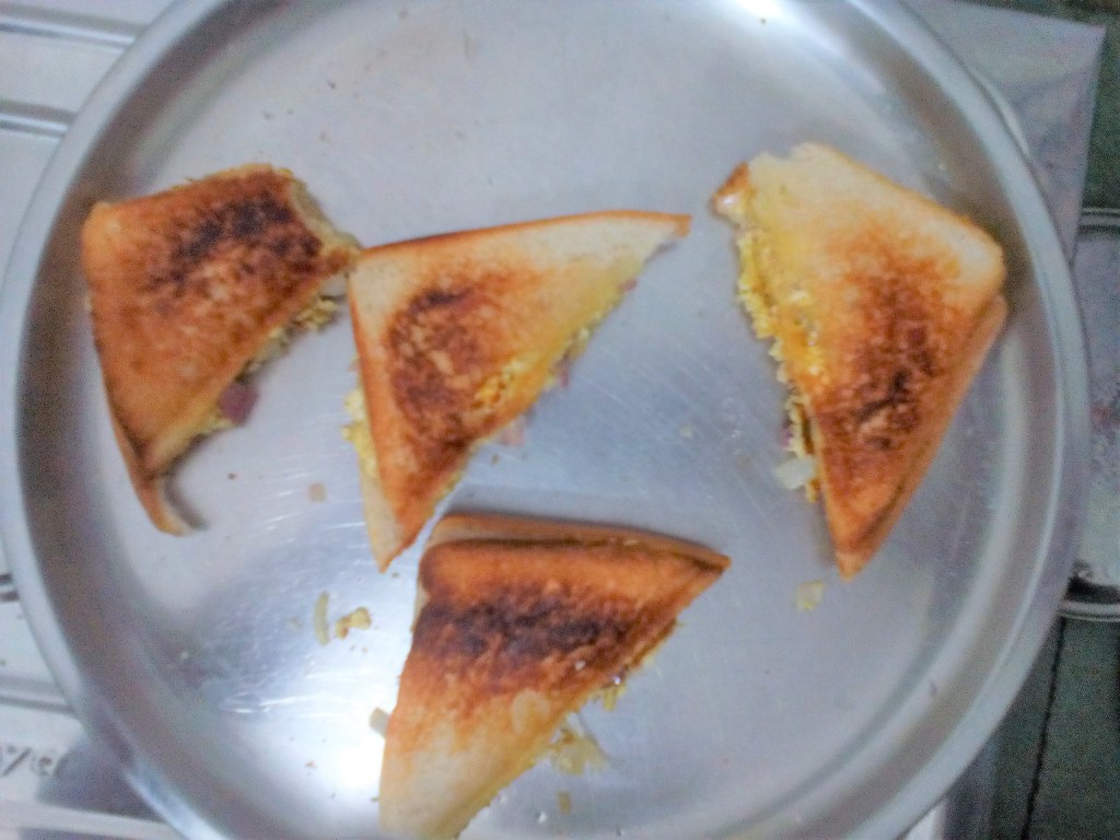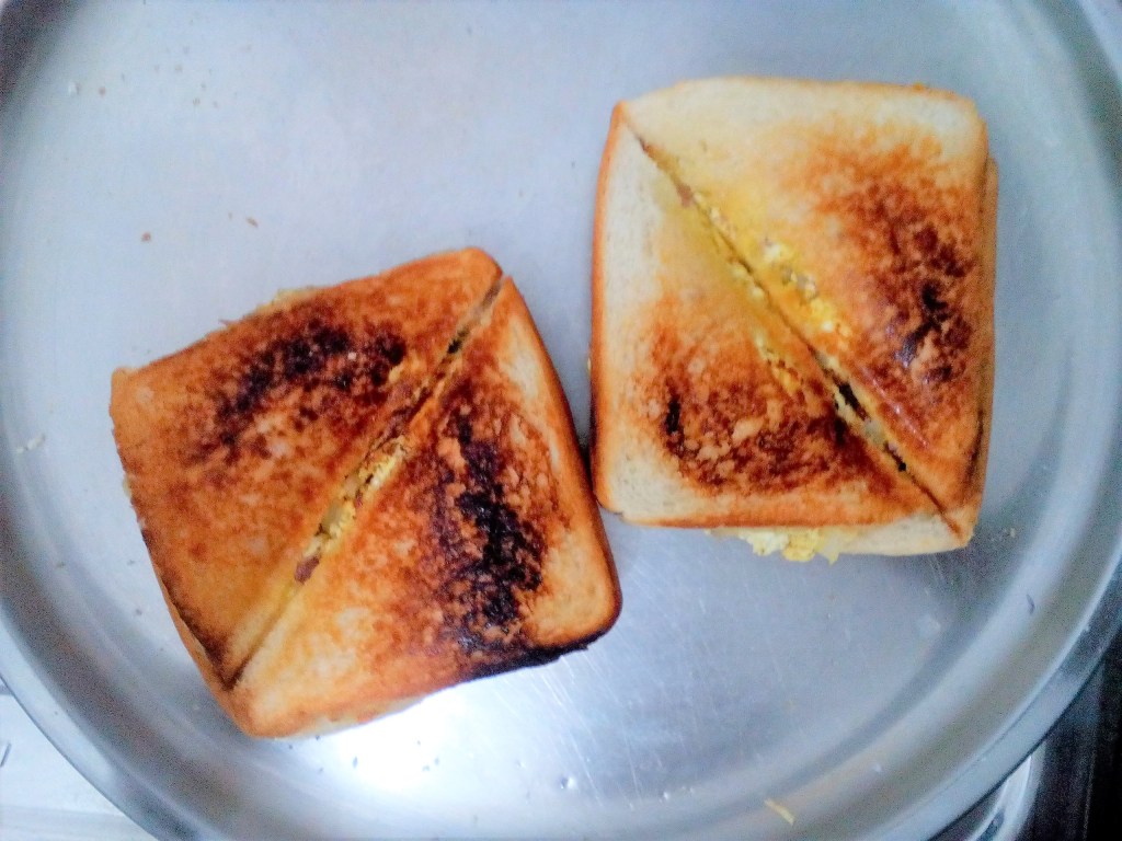 My office family gifted a sandwich maker and a blender on my birthday. Here’s first use picture. My dinner tonight. Missing hubby a lot.