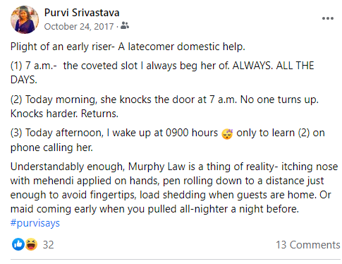 October 24, 2017June 28, 2022 purvisrivastava FB diary- 2017 Oct 24 -Murphy’s Law Link- https://www.facebook.com/purvi23.srivastava/posts/pfbid02UzGZddrptc9HoE59ZeTLGq5Szwb5JGZN8GRFpE9keg27mKvqBBZVzpjJWtALraiQl Share this: Click to share on X (Opens in new window) X Click to share on Facebook (Opens in new window) Facebook Like Loading... Related