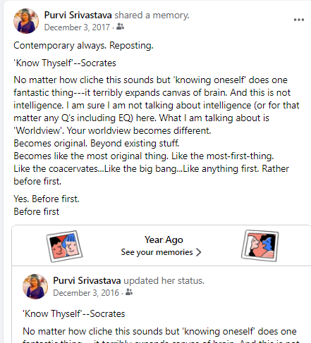 December 3, 2017June 28, 2022 purvisrivastava FB diary- 2017 Dec 3- Know Thyself Link- https://www.facebook.com/purvi23.srivastava/posts/pfbid02QAN24xqMdwWeJqm937kL9uxUhLct2C9P18TMw7raysZNd7T9ijnnuzCGMZ3nE6Bnl Share this: Click to share on X (Opens in new window) X Click to share on Facebook (Opens in new window) Facebook Like Loading... Related