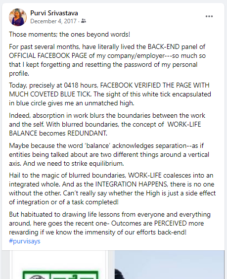 December 4, 2017June 28, 2022 purvisrivastava FB diary- 2017 Dec 4 – This badge! Thank you, Facebook. Link- https://www.facebook.com/purvi23.srivastava/posts/pfbid02WE26hZ5ezFrZzLVcwaFPxYUFm7W25kyJKgSAk5vFAKcaN6GWBH9JXbbRXVR8grCgl Share this: Click to share on X (Opens in new window) X Click to share on Facebook (Opens in new window) Facebook Like Loading... Related