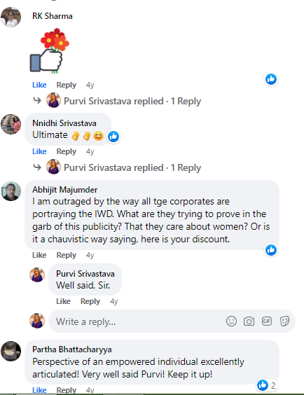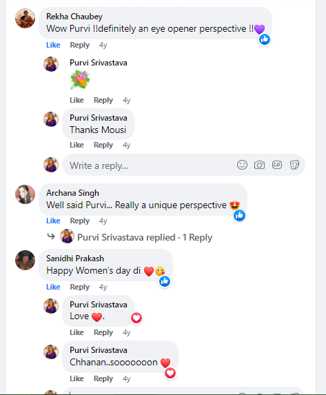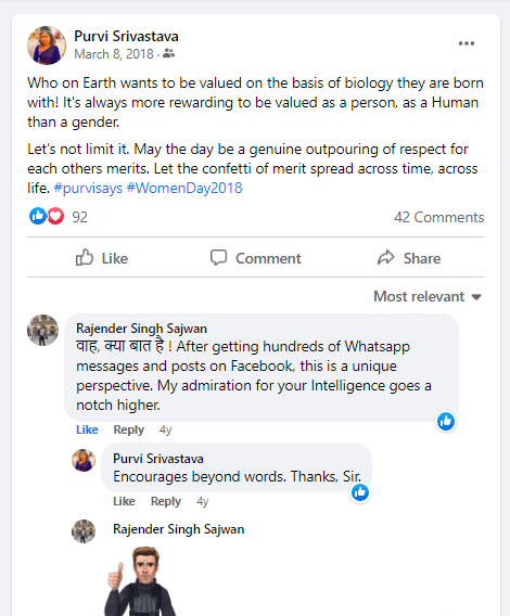 March 8, 2018June 28, 2022 purvisrivastava FB diary-2018 March 8- Women’s Day Link- https://www.facebook.com/purvi23.srivastava/posts/pfbid0RsrXGpJCpJYxm4EmyzppmyEEdVCetsmFnAf4r28GcJ81NXMEFVeKojB6uzRkLZRJl Share this: Click to share on X (Opens in new window) X Click to share on Facebook (Opens in new window) Facebook Like Loading... Related
