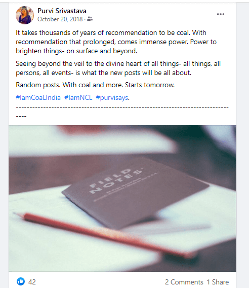 October 20, 2018July 1, 2022 purvisrivastava FB diary- 2018 Oct 20- It takes thousands of years to be coal Link- https://www.facebook.com/purvi23.srivastava/posts/pfbid0M71TbzbvkystpPBpHwqK22uFVyk54tsS8Fhebt2ecqfpkcdNSZTcGiEhD1kGdeU8l Share this: Click to share on X (Opens in new window) X Click to share on Facebook (Opens in new window) Facebook Like Loading... Related